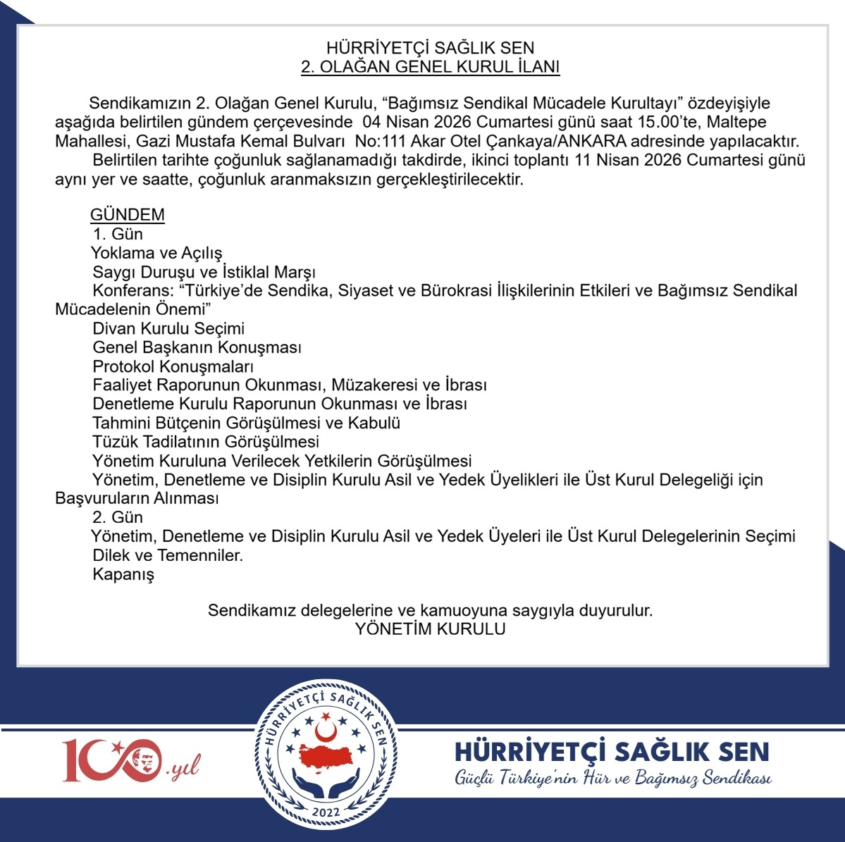 9-Sağlık ve Sosyal hizmet çalışanlarının kamu hizmetleri süresince ve emekliliklerinde insan onuruna yaraşır bir hayat sürmelerini sağlamak için mücadele eden sendika.